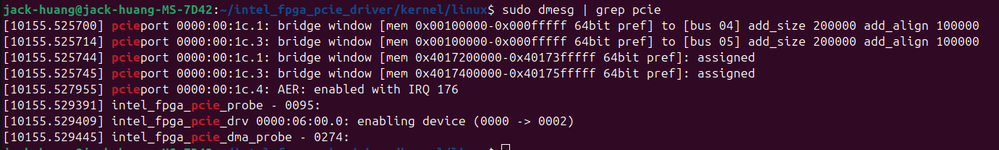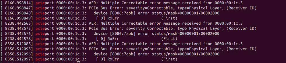 - sudo dmesg | grep pcie shows errors from the FPGA PCIe port to the PCIe bus