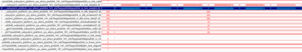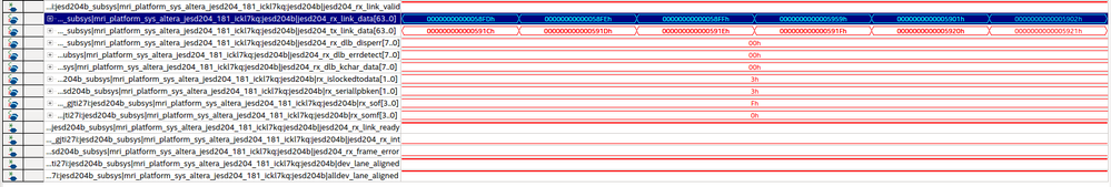 I'm currently trying to implement the JESD204-IP Core to receive data from an ADC on an Arria 10 using Quartus Prime v18.1. To test the receiver I implemented both channels (TX and RX) of the Transceiver and manually switch into loopback mode. After initializing the link I transmit a ramp, which almost works fine. Occasionally and not reproducable the data in the receiver is wrong, even though the transmit word is correct.
