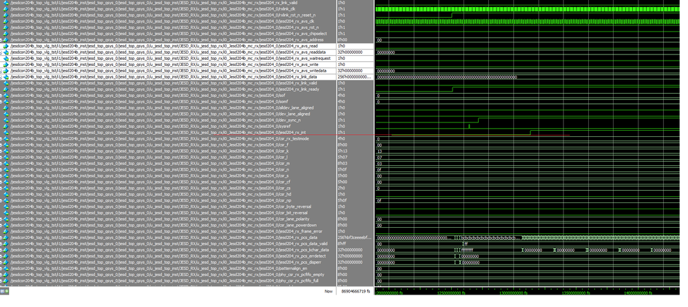 I have a module that instantiated 4X 4 lane phy modules and 2X 8 lane base modules. The i0_Jesd204B_mc_rx is one of the 8lane base module. After the sysref and dev_sync_n. The jesd204_rx_pcs_data show up “bcbcbc......”. Then Jesd204_rx_int asserted high.