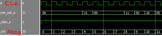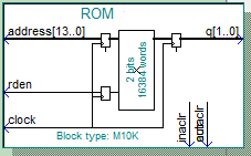 ROM has 2-bit wide output bus and 13312 words (2-bit words), single clock with rden and registered output.