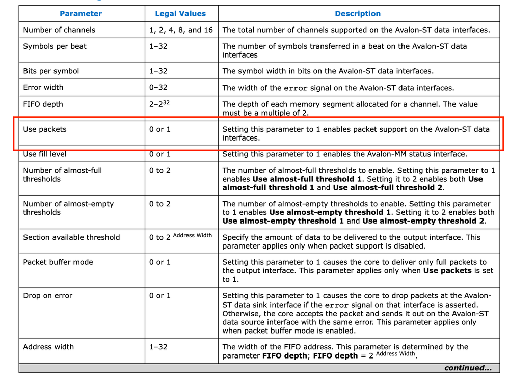 I'd like to use the multi-channel shared memory FIFO in my design. In the 20.2 version of the Embedded Peripherals IP User Guide, the chapter describing the usage of the core states several options that do not appear to be visible when configuring the core in Platform Designer. Of note, is the missing option to enable/disable packets (packets are enabled by default, I would this option disabled. The guide suggests this is possible).