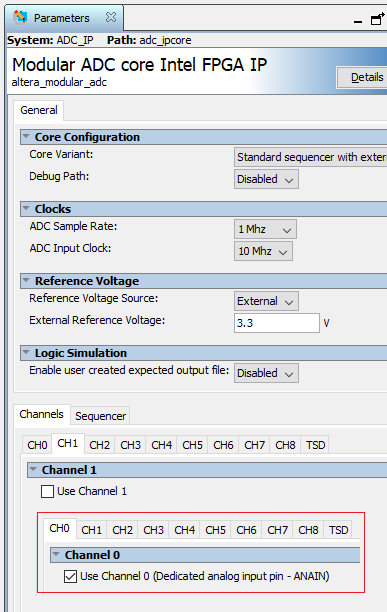 I want use Modular ADC core Intel FPGA IP. But ANAIN iput only (10M08SAE144I7G). Another ADC pins (Channel 1, 2...TSD) not, this pins are used as GPIO.
