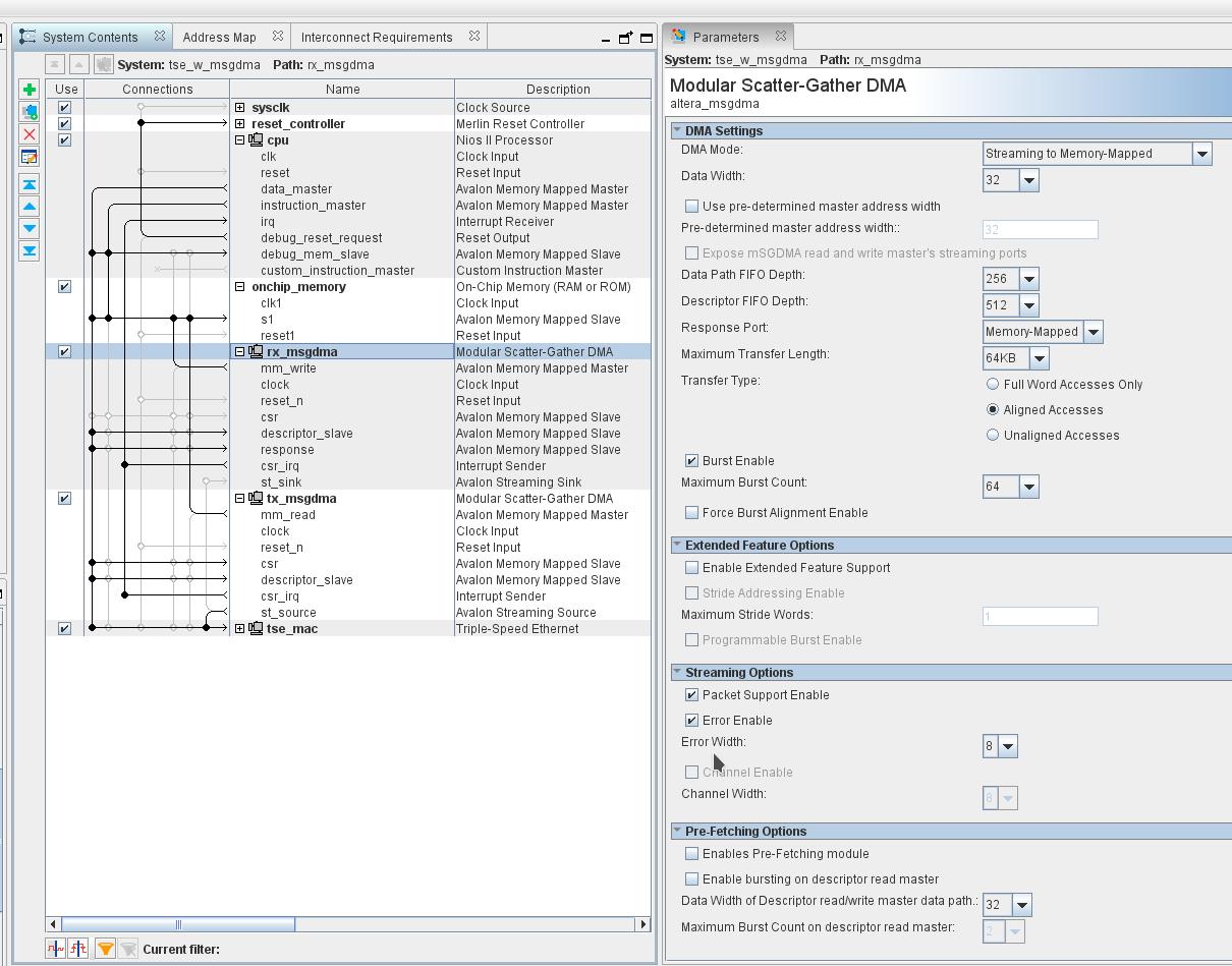 with Quartus Prime Altera has added the mSGDMA IP core to Qsys (in Pro version it is the only DMA core available). However there has long been an mSGDMA IP on alterawiki and I am not sure to what extent the two resemble. This name conflict makes information search on internet even more complicated... My system starts the NicheStack, intializes succesfully (at least reported as succesful to STDOUT) but the RX_SGMDA never seems to accept data from the MAC (I can see with SignalTap that MAC backpressure is ON, PCS received correct frame data in buffers but no transfer to main memory is completed). My guts tell me it has to do with the descriptors. I assume it can be either: - wrong QSYS wiring (there is no reference design using this new core - only a few designs using the sub-core units) - but this is unlikely, the wiring seems intuitive - wrong software configuration (MAC profile wrong?) - NicheStack bug (support added recently with Q17.0) What I do: qsys (see attachment) - no external descriptor memory instantiated - connected the AvlMM master (mm_write) to main memory - all AvlMM slaves (descriptor slave, response, csr) --> cpu.data_master bsp- compilation with