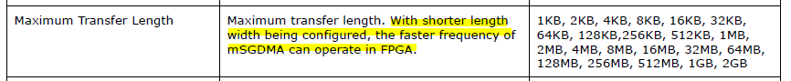 In the Embedded Peripherals IP User Guide under msgdma maximum transfer length , it is mentioned that "With shorter length width being configured, the faster frequency of