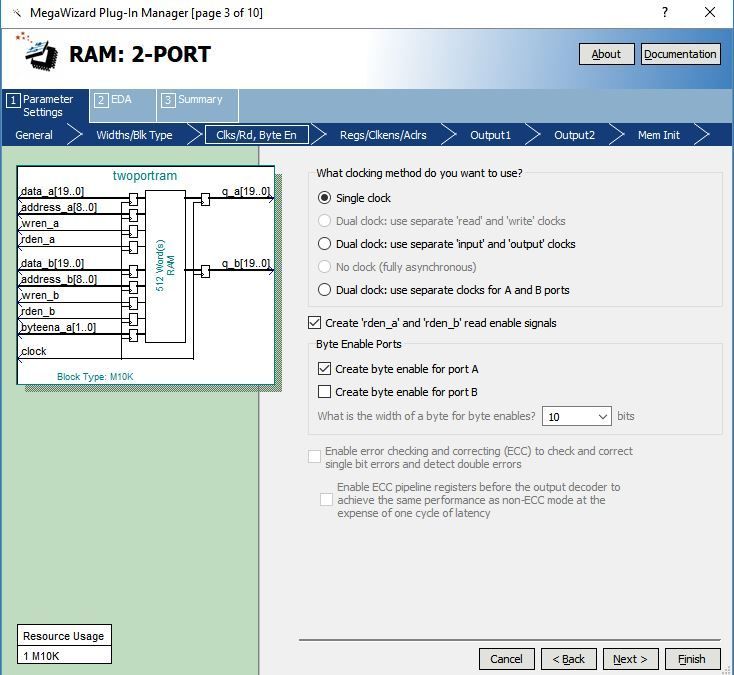 while setting 2-port ram the option " what is the width of a byte for byte enable?" drop down box by default have 10 bits selected, if we click on next we get this error.