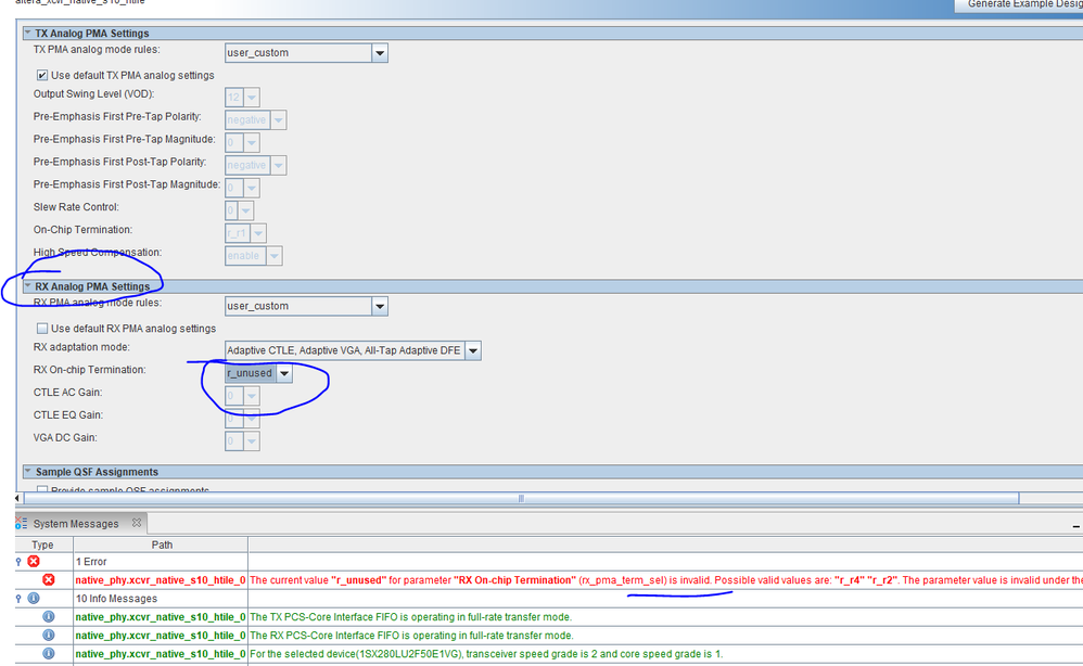 I checked setting the same in Native PHY, the error message is listed saying that r_unused as invalid. What is the procedure to set external termination for receiver pins?