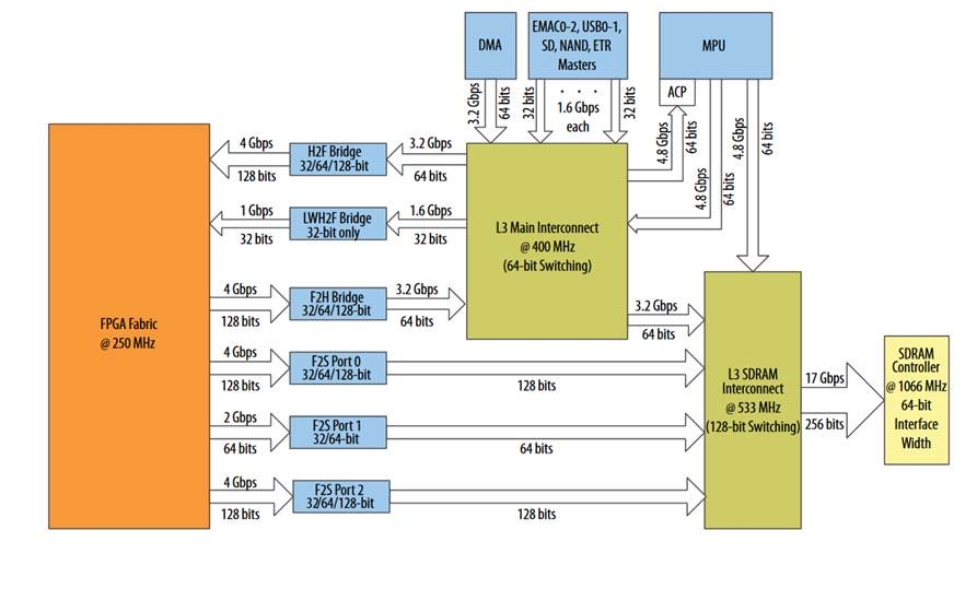The picture shown below is the memory architecture of an Arria 10 SOC where as I used fsdram0 and fsdram2 bus with width of 128bit(port configuration 3)