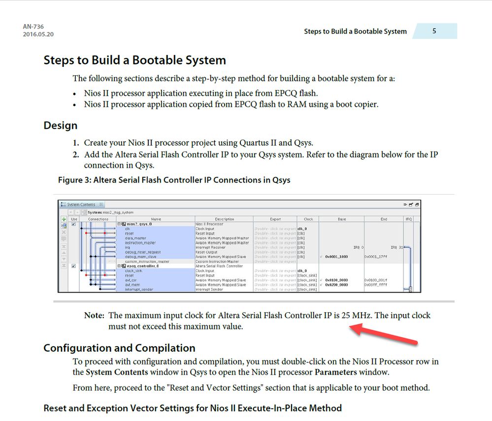 I would like to confirm that the serial flash controller IP is only recommended to run at 25 MHz clock, as per the application note AN-736 on the website updated on 2016.05.20.