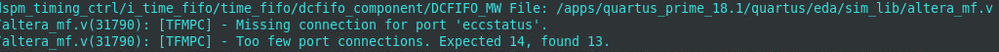 However in the instantiated interface of dcfifo_mixed_widths, there is no eccstatus signal. I think that's what Questa compiler complains about. I acknowledge that we use the already compiled simulation library, and I assume the source code and compiled simulation library are matched.