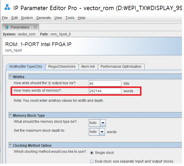 So the total memory bits will be 40 x 262144 = 10,485,760. You can verify it by checking compilation report. Fitter > Resource Usage Summary.