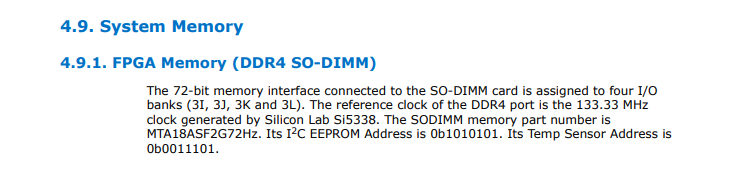 I'm using the 16GB FPGA DDR4 Memory on the Stratix 10 SX SoC Development Kit. When I'm configuring the emif for the FPGA Memory I cannot find the correct timing parameters for the given memory in the development kit. The memory part number is MTA18ASF2G72Hz and the speed bin is -2400. However, the example provided in intel's website (https://www.intel.com/content/www/us/en/products/details/fpga/development-kits/stratix/10-sx.html) is using a memory whose speed bin is -2666. And I cannot find this memory in the provided presets.
