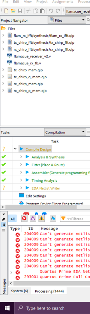 I am not sure if the snapshots I included will be easy to read on your side - the purpose of attaching these is to show the .qip files look present under the Files section of Project Navigator, as well as the Hierarchy section. Simultaneously it can be seen that the EDA Netlist Writer step of compilation is incomplete, and an error such as 204009 can be seen in the terminal window.For the record, "Intel FPGA IP Evaluation Mode" is set to Enabled.