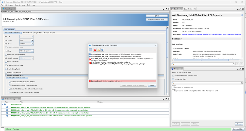 It is alright. I wanted to generate the example design to Validate AXI Streaming Intel FPGA IP for PCI Express in my device.