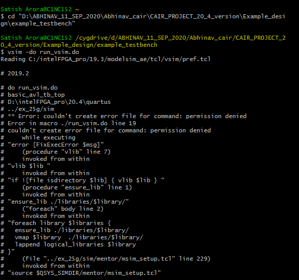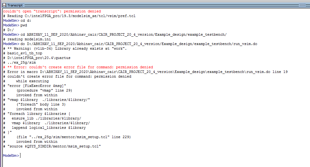 I am trying to run simulation for the 25g Ethernet IP for startix fpga with fpga number 1SGO85HN2F4312VG. As per @https://www.intel.co.jp/content/www/jp/ja/programmable/documentation/gkr1505413442088.html#ezc1519265402640 I am running the simulation on modelsim. I am facing some issues in running the script.
