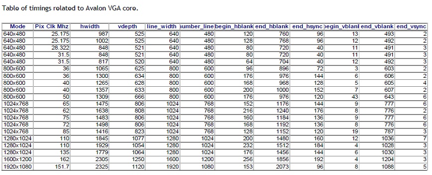 on Altera Cyclone III video development card with Bitec HSMC DVI input/output daughtercard to display a mixed video (non interlaced) on a DVI monitor. I want the CVO modes to display different output resolutions:1280x1024, 1024x768 and 800x600 The default mode configured in the QSYS hardware is for 1024x768 resolution. The way I configure the modes is: set mode invalid, write registers, stop CVO, set mode valid, start CVO. When I run this and ask for the "Video Mode Matched" register I get "0" with a 1024x768 input and it displays the image. But after changing the input I get the different modes from "Video Mode Matched" but I don't get any image and the display enters into sleep mode. So, my questions are... Where can I find all those video parameters, in case i'm not adding them correctly? Are there any examples which uses different output modes? Is there another possible error in my design?
