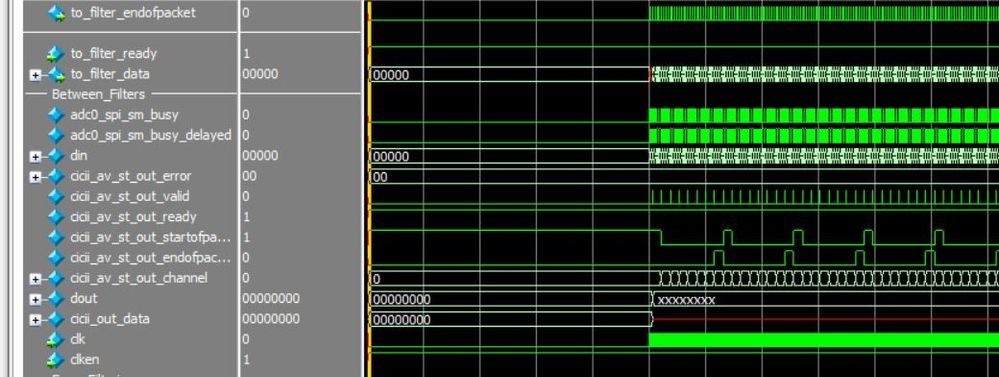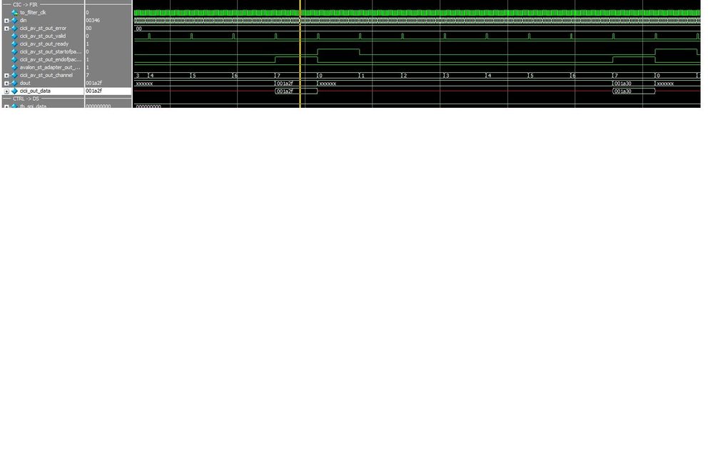 Hi, Just to update you on the latest finding. For your information, I have managed to perform simulation with IP (mimic your configuration) generated example design and there is no issue with the simulation after applying the fix that you mentioned in the previous note for test_program.sv. Input data and output data looks normal in the example simulation. As I further look into your design simulation and cross check with the example simulation, I observe that in your design, the first batch of in_data to CIC IP has invalid bit[17] = StX as shown in the invalid first batch of input data.png. I suspect that due to this invalid first batch of data, it leads to corrupted data for the subsequent output. I have then tested forcing the in_data to a dummy data in your top level file and rerun the simulation. After feeding valid data, I am able to see valid output at the CIC IP in the simulation as shown in the after_fix_first_batch_data_ok.png. It would be great if you could help to look into your data source to the CIC in_data to see what might have cause the first batch of source data to be invalid. Note that I am unable upload the screenshot to the case, probably due to server issue. Thus, I am sending them to you through email. Please let me know if there is any concern. Thank you. Best regards, Chee Pin