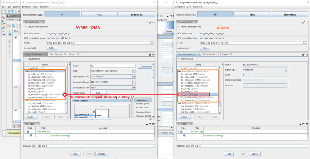 so my question is : waht's the reason of this difference ? Does this "txs burstcount" miss in AVMM-DMA interface would affect the reading (burst) opearion from mSGDMA AValon-MM Master to PCIE HIP TXS (avalon-mm slave) ?