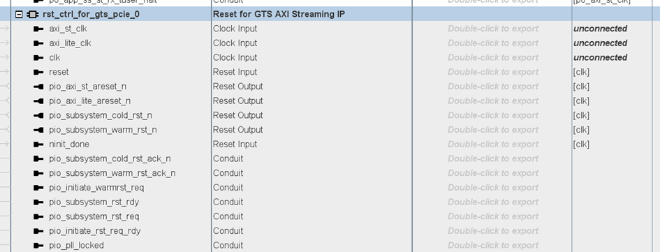 The 'Reset for GTS AXI Streaming IP' should/can be connected to the GTS PCIe IP.