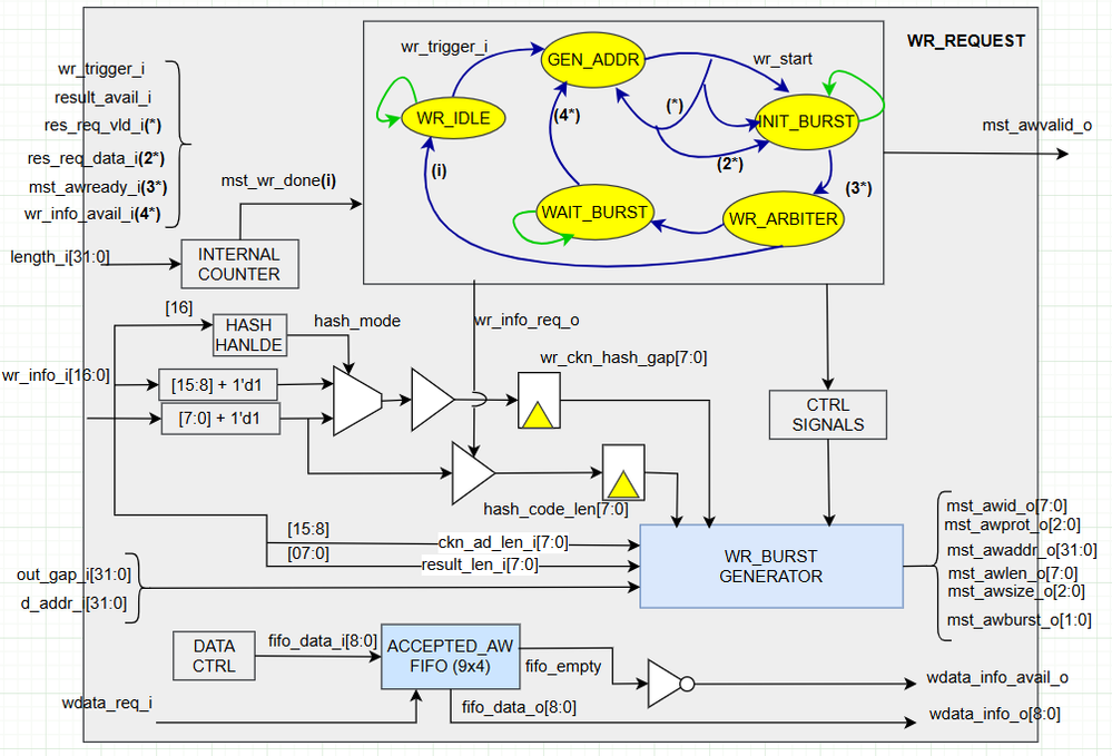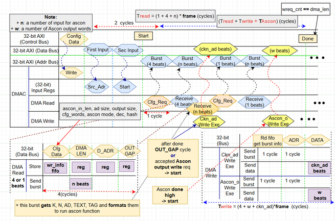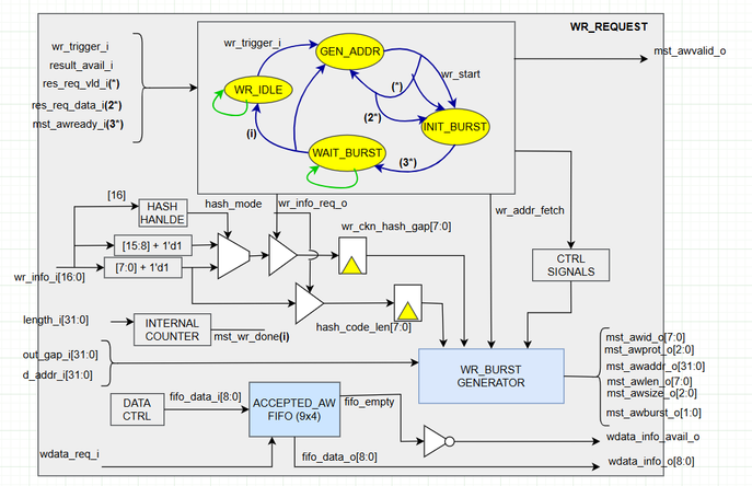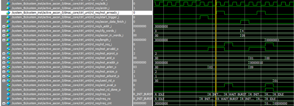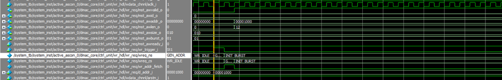 As program runs at simulation mode, read burst request runs well, but write burst always encounters problem (awready is always "0" logic level), so DMAC always wait slave, leading