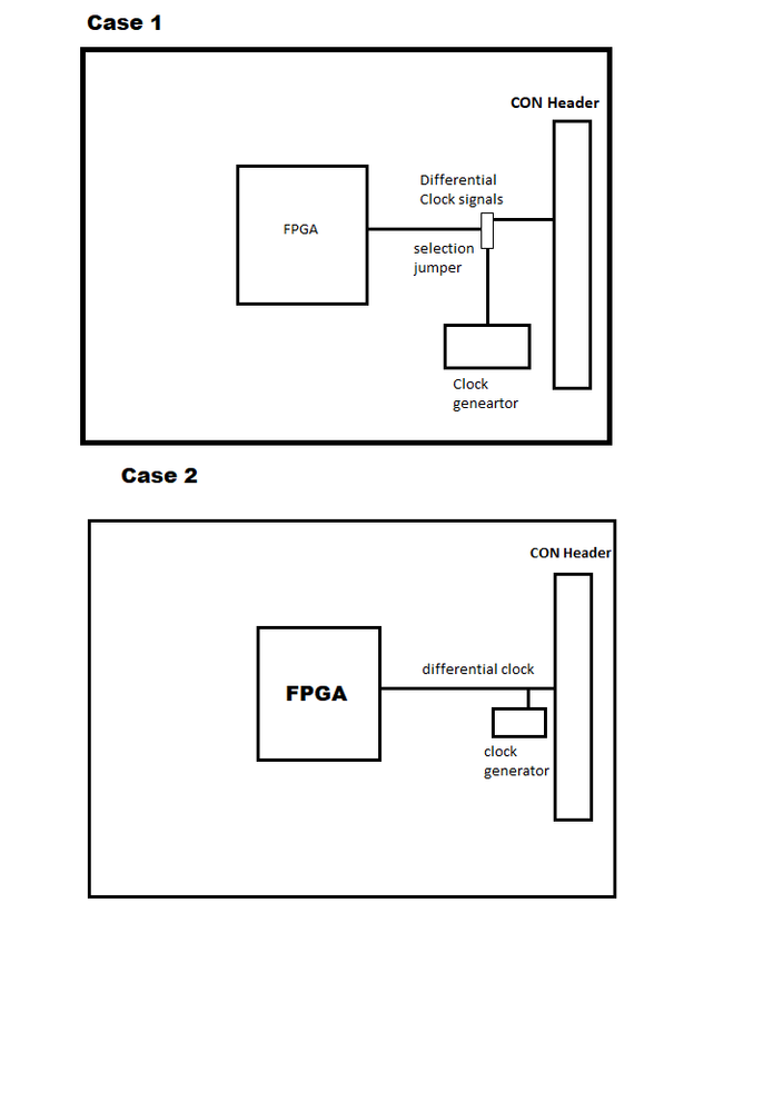 I am designing Main board using Altera FPGA. In circuit I need external differential clock. On main board I have introduce one clock generator circuit also have provision to take clock from external daughter board. Clock frequency range is 10-200MHz.