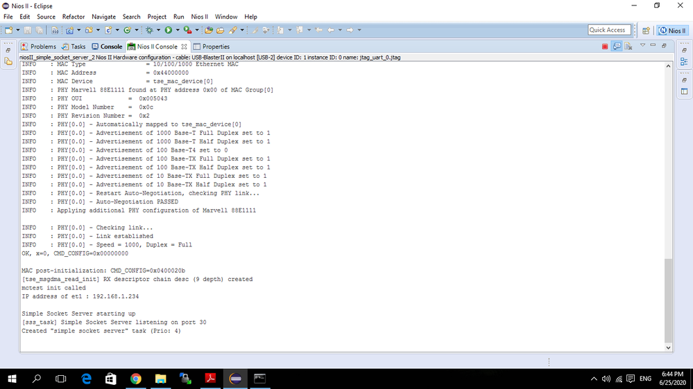I've been trying to implement Simple Socket Server for Cyclone V GT and I have been following the steps mentioned in the pdf by Intel. (https://www.intel.com/content/dam/www/programmable/us/en/pdfs/literature/tt/tt_nios2_tcpip.pdf)
