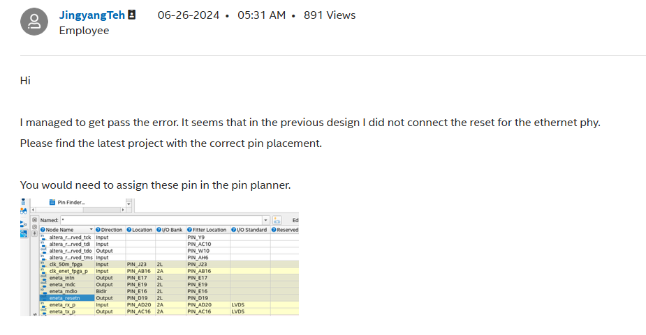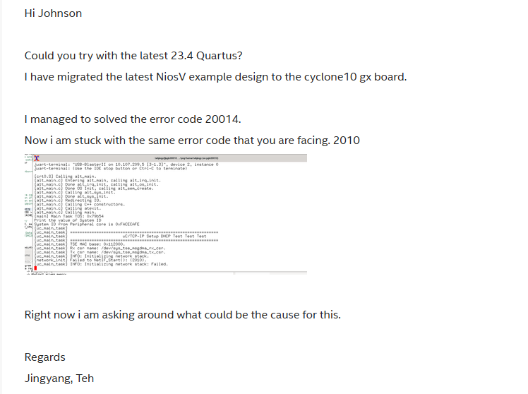 Cyclone 10 GX Nios V: TSE with mSGDMA Not Responding to Ping