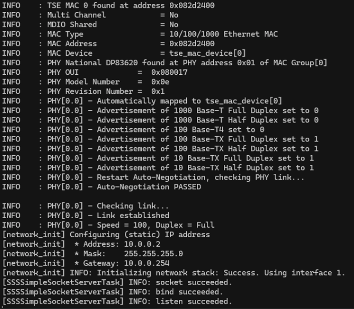 I have configured an IPv4 address, subnet mask, and gateway using NetIPv4_CfgAddrAdd. Additionally, the socket() creation, bind(), and listen() calls in my socket server task all succeed without errors.