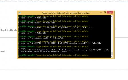 I am using Cyclone V from Terasic Soc kit and now trying to make driver for Hps to FPGA bridge. I have Quartus and SOCEDS 15.0. I have started with Workshop 3 from rocketboard. https://rocketboards.org/foswiki/view/documentation/ws3developingdriversforalterasoclinux So, I download image, set ENVIRONMENT variable. After that I try to execute first example which is lab_module. So basically I create KBUILD file, make file and after that While, I am trying to executete Make file I got error: makefile:2 *** OUT_DIR is undefined, bad environment. you point OUT_DIR to the linux kernel build ouutput Directory & stop.(PFA) Basically I am not able to execute make and it seems to be compilation error, and I am not able to build the kernel module. I already cross check environmental variable, its: export ARCH=arm; (for ARM achitecture) export CROSS_COMPILE= <path-to>/toolchain/arm-linux-gnueabihf (cross compiler toolchain) export OUT_DIR=<path-to>/socfpga-3.10-ltsi (linux kernel source tree) Could any one help me to solve this?