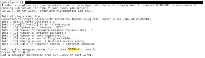 >> ash-riscv-gdb-server --auto-detect true --probe-type usb-blaster-2 --tap-number 1 --device 034BB0DD --core-number 0