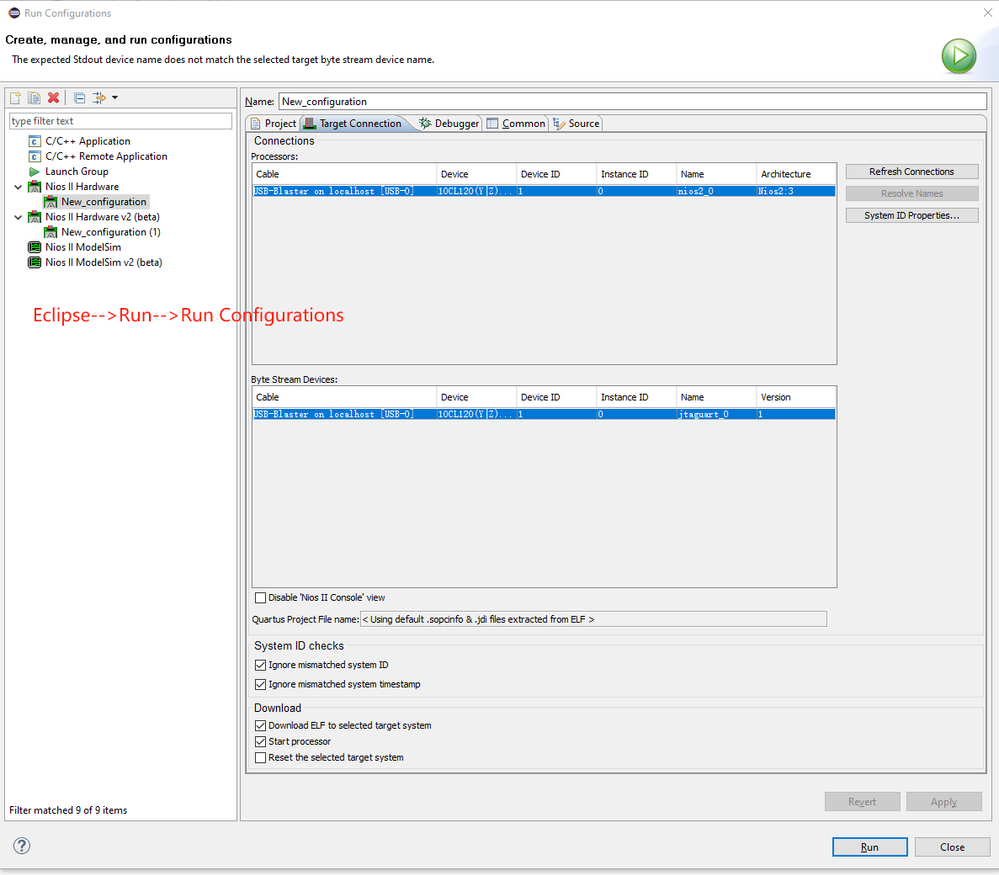 Eclipse-->Run-->Run Configuration doesn't burn elf to ROM in NIOS II
