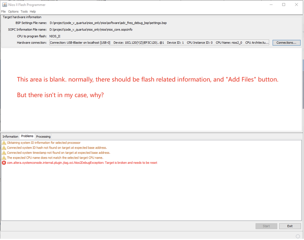 1) The tools report error: Target is broken and needs to be reset, however, Quartus-->Tools-->Programmer is able connect and burn jic file to flash.