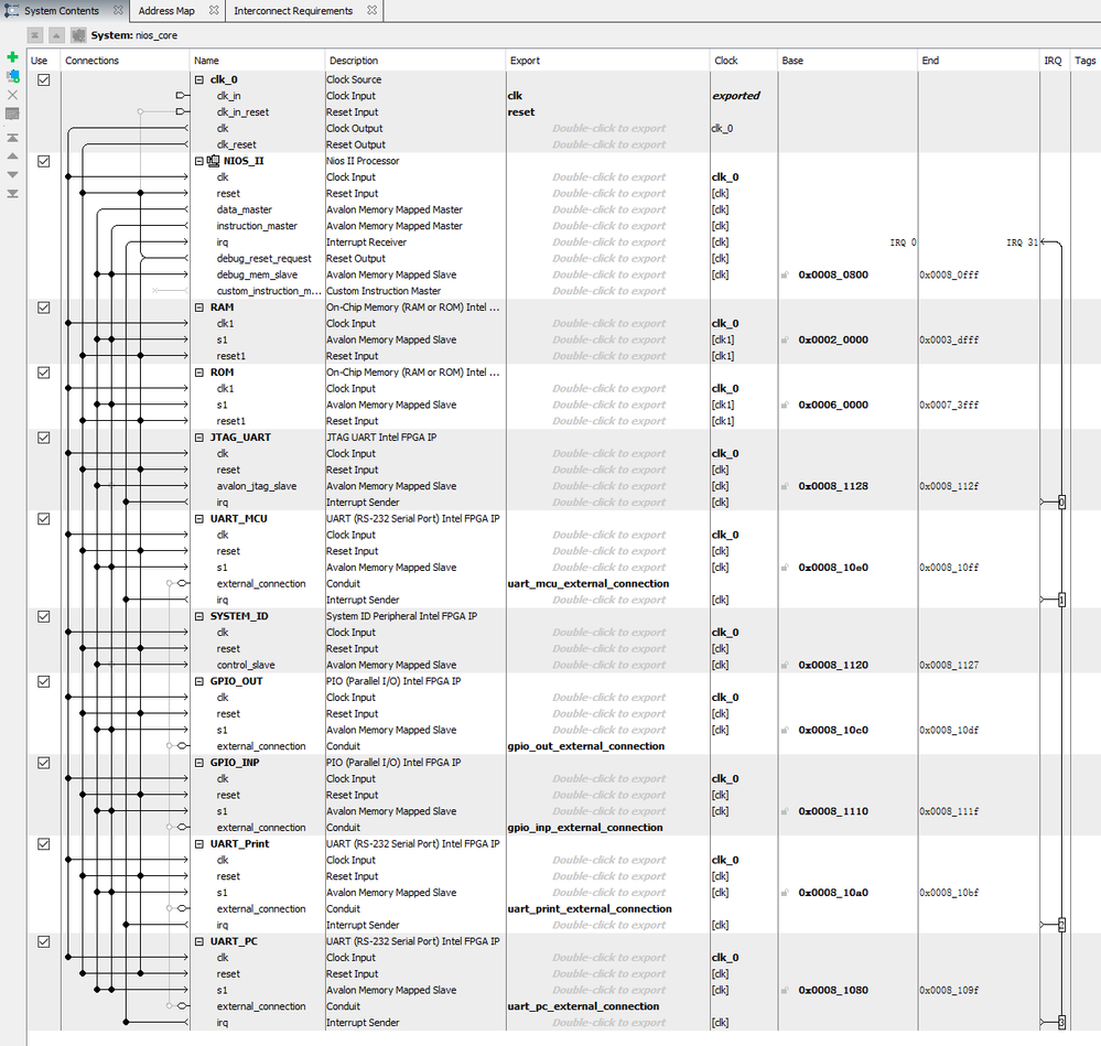 char c = altera_avalon_uart_read(UART_2_BASE, 0, &status);You must manually manage which UART is used for which purpose by assigning consistent names (uart_for_jtag, uart_for_mcu, etc.) and referencing the correct *_BASE and *_IRQ macros
