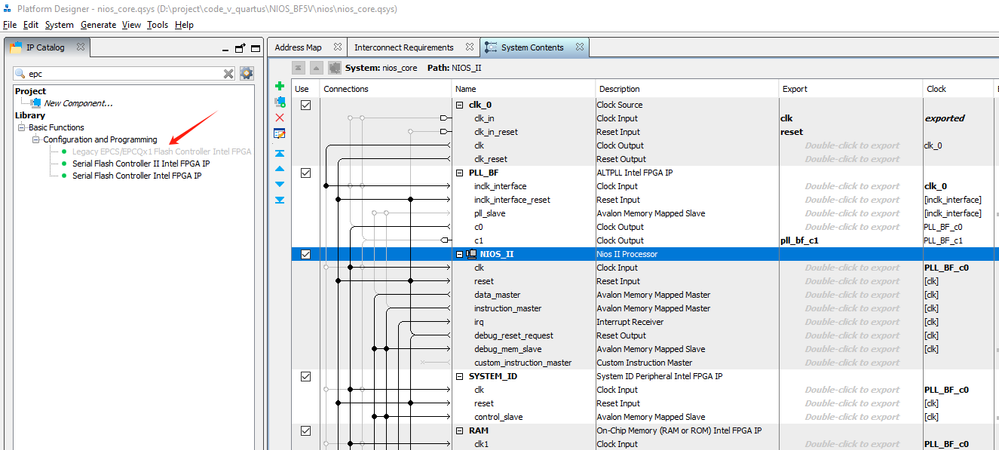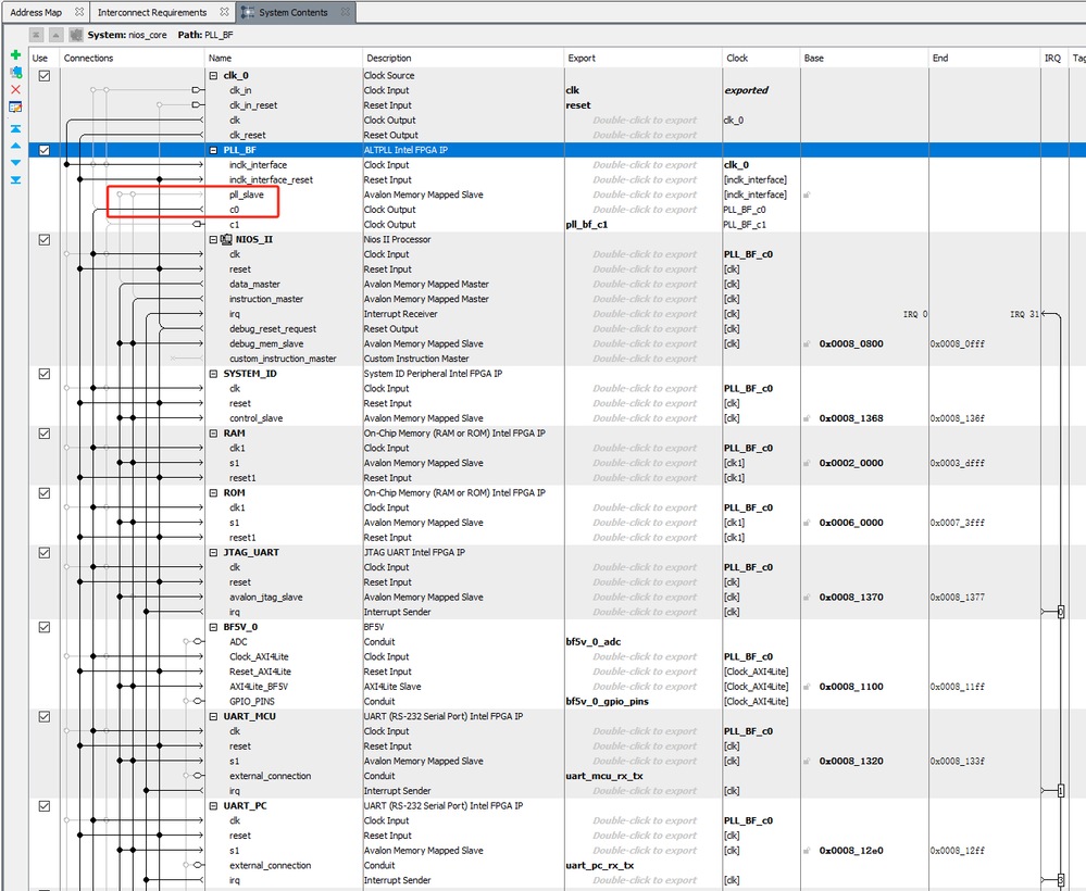 - Export its base address (double‑click its port on the “Export” column) so that system.h sees something like #define ALTPLL_SLAVE_BASE 0x...?.