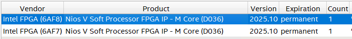 I activated the free NIOSV/m license in Altera Self-Licensing Center and I'm using it as a floating license. I can see the license in Quartus License setup: "Nios V Soft Processor FPGA IP - M Core (D036)".