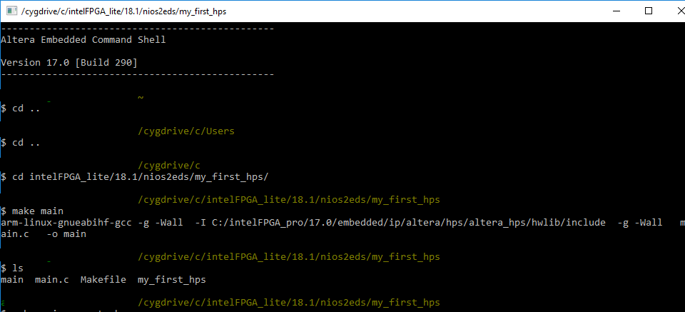 For compiling apps on HPS, you should use the embedded shell prompt and not the NIOSII prompt. IF you 've installed SOCEds tool chain you should have an embedded folder, go to that folder and double-click the .bat file to open the ARM embedded command shell.