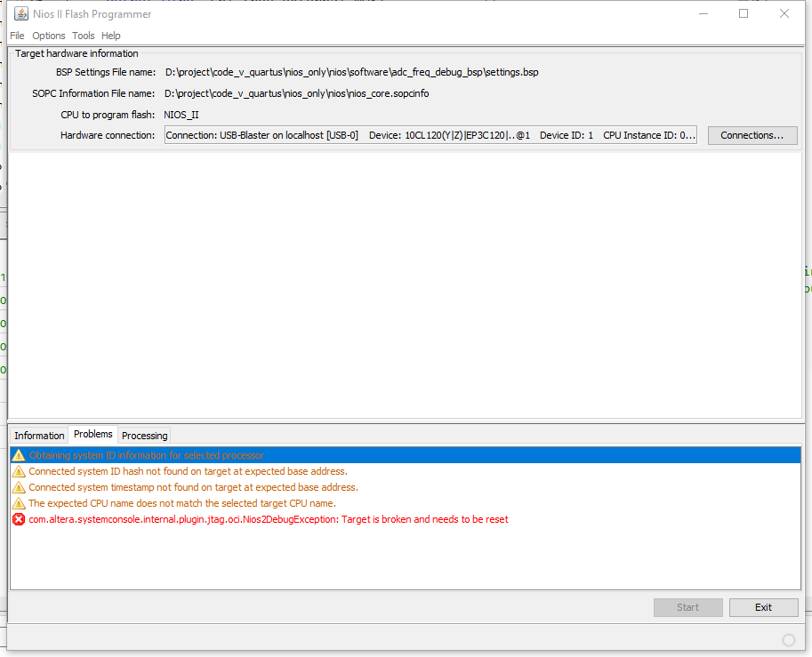 In this thread, I was told the flash M25P64 is not compatible: https://community.intel.com/t5/Nios-V-II-Embedded-Design-Suite/Target-is-broken-and-needs-to-be-reset/td-p/1688694