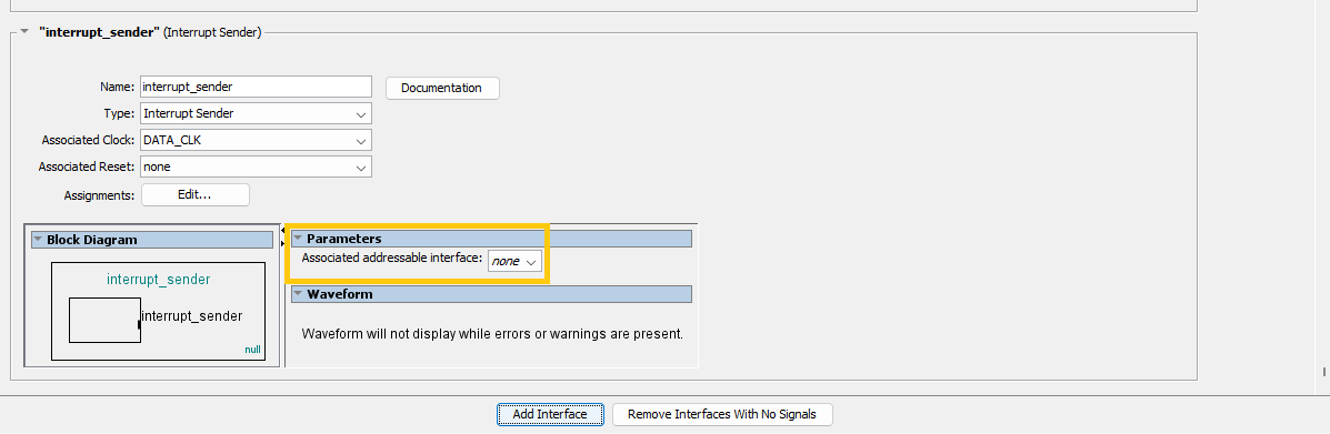 I’ve attached two images to this message. One shows the platform design in Quartus Prime Pro 23.4, and the other corresponds to Qsys in Quartus || 13.1. Qsys has a parameter called "Associated addressable interface" for an "Interrupt Sender". However, this parameter is no longer available in Platform Designer in Quartus Prime Pro. Instead, I only see the parameters "Bridged receiver offset" and "Bridges to receiver."