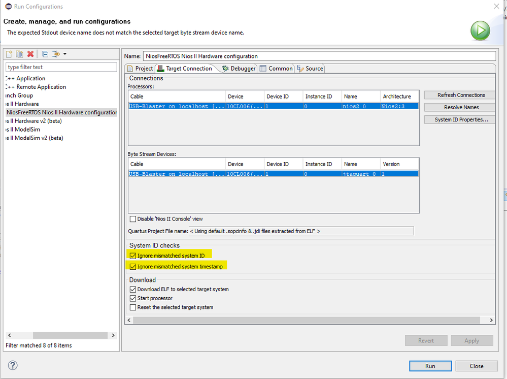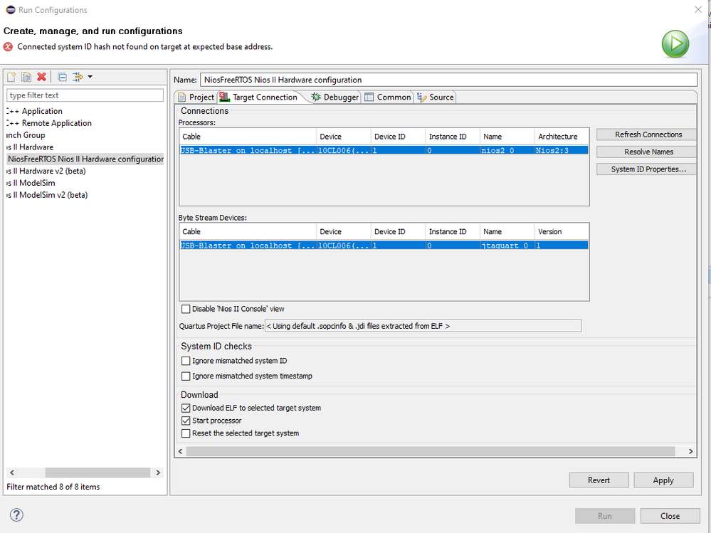 If I tick the boxes in the Run As Configuration that make Nios ignore the ID and timestamp values from the sys id, I get an error saying "Downloading ELF process failed". I think there must be something wrong with the communication with the board, but can't figure out what it is.