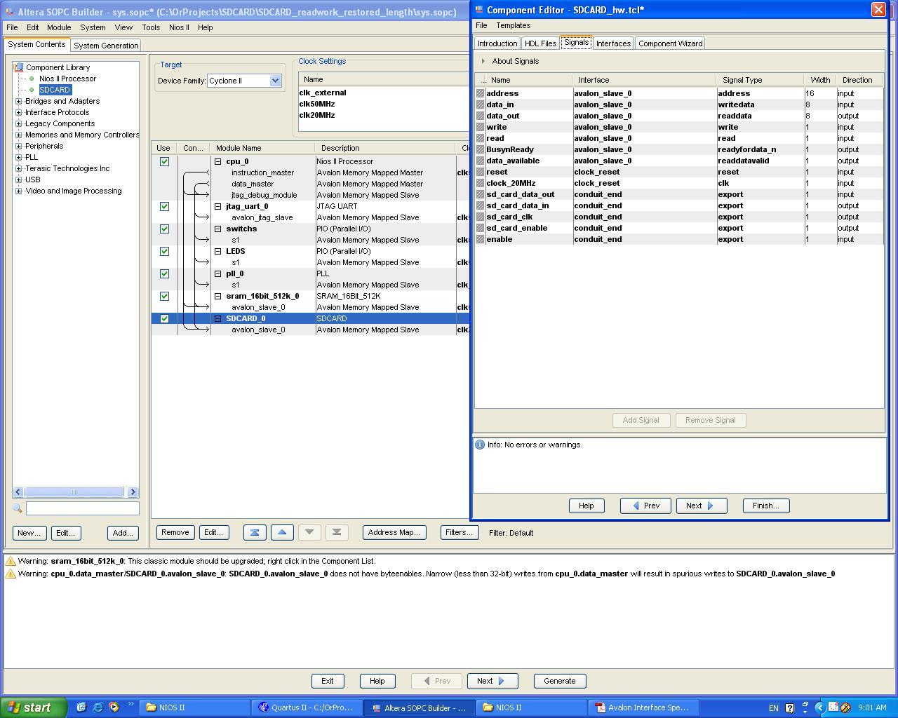 What I'm trying to make is an easy interfacing with the SDCARD module I built based on VHDL. I want to read or write from the SDCARD Mem only by using single write or read command. When I tried to convert my VHDL module to Custom Component, I have found out that the communication between my module and the AVALON is nothing like the waveforms at the datasheets and at the SOPC software (I'm working with Quartus 9.0). My problem is when I'm sending threw the NIOS IDE console simple "write" command, the AVALON sending 4 pulses of write on the "write" line instead of one. And that's not all, at the first pulse I receive threw the "writedata" line, the data I have inserted threw the console, and at the 4th pulse I receive threw the "address" line, the address I asked for (sometimes it's the wrong address). Another problem I have is when I'm inserting "read" command the AVALON sending me the address on the "writedata" line. This is very confusing, I don't think its have smth to do with my module, the only thing that I changed from other modules is that the system clk is 50M and the SD clk is 20M. I added few pictures of the data I receive on the signal tap, and the commands I send threw the console. And here's the index: PIC1-read mode, the AVALON sends the address to the "writedata" input. PIC2-while I'm sending threw the NIOS IDE write command, he generate 4 cycles of write, while at the first one he locking the data, and at the last he gives me the address, in this example,he give me the wrong address, i can upload exapmle with the right address at the 4th pulse. * Data_in - writedata Data_out - readadata * I can really use some help, thnx