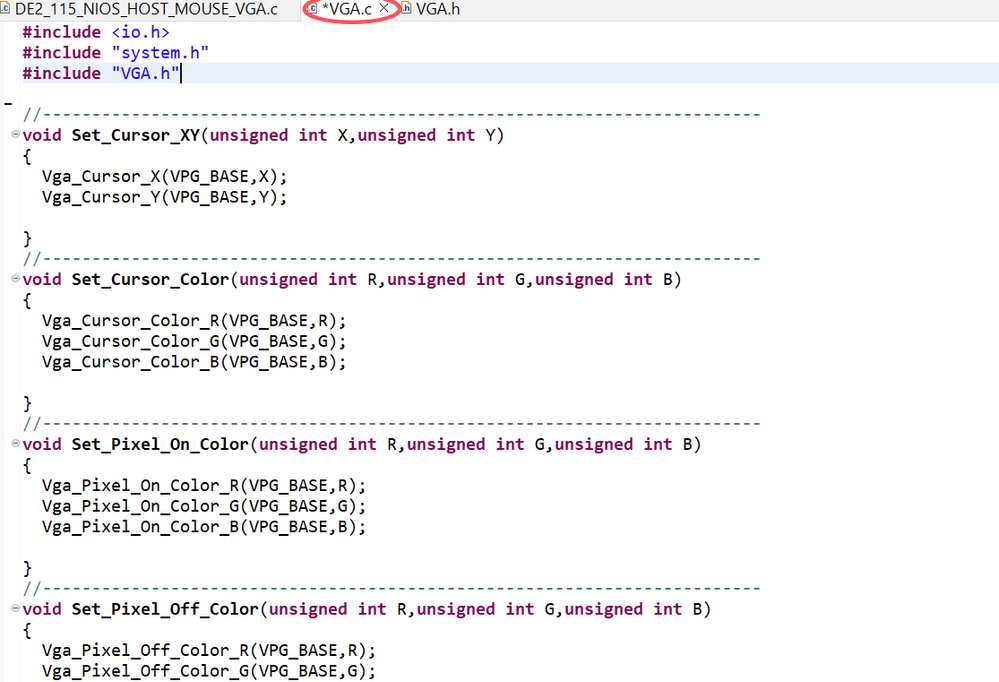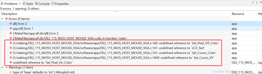 I created a Nios V based software, where VGA.c, VGA.h and main.c are included, after building the project, it indicated few "undefined reference to" errors, as shown in figure below.