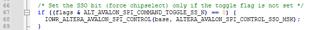 To verify logically, I removed the chip select control from the SPI driver and instead controlled it manually using a PIO-based GPIO macro( this line IOWR_ALTERA_AVALON_SPI_SLAVE_SEL(SPI_BASE, SPI_SLAVE_SEL); and the end line where i am writing 0x00 to spi_slave_sel i replaced these two lines with PIO_MACRO) — pulling CS low at the start and high at the end.