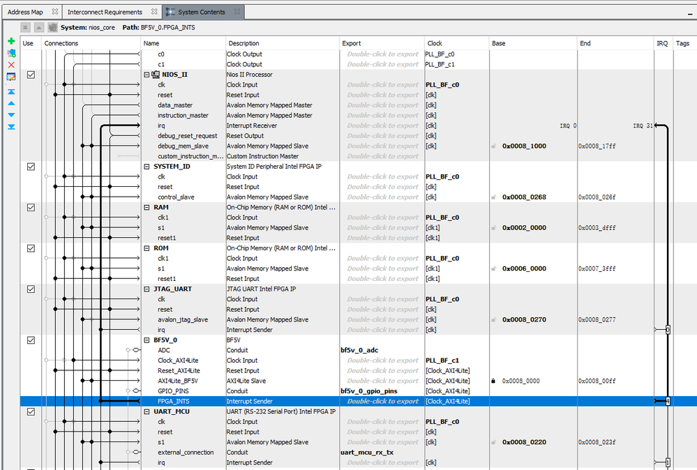 I then connect the FPGA_INTS to irq of NIOS. Please see my picture below.