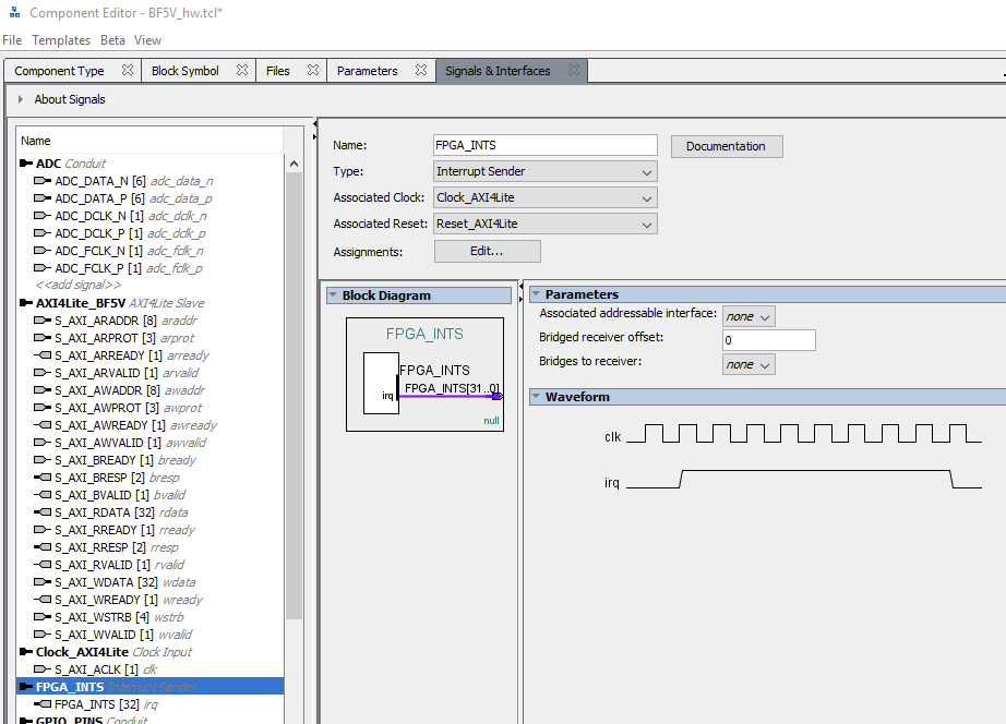 I firstly created a new IP, and I add the interrupt sender FPGA_INTS. please see my picture below.