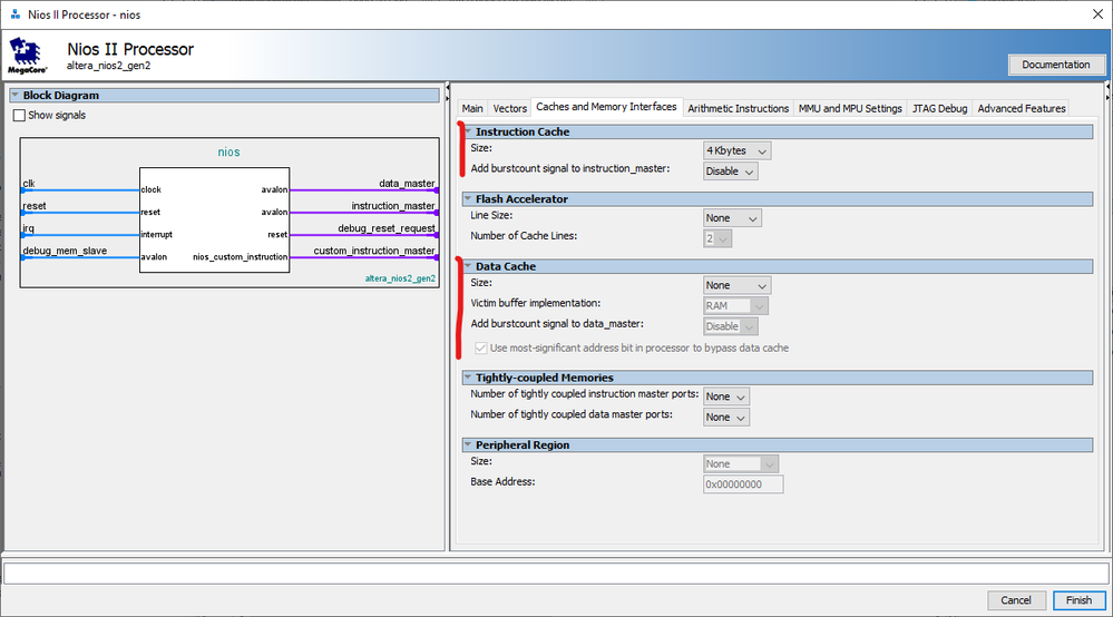 The NIOS data cache is disabled, whereas the instruction cache is enabled (see below). I use only the IORD and IOWR functions to perform registers and peripherals accesses.