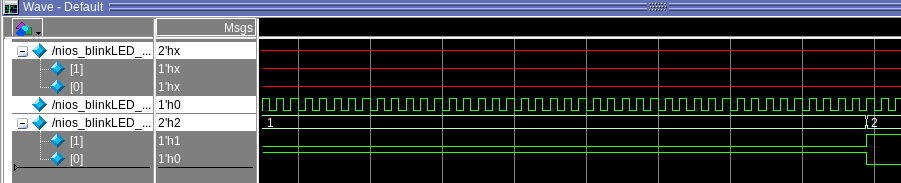 what I really want to do, is provide input stimulus signals like we would do for an HDL design. So I can have the LED toggle when the button signal goes high. I would flip the button on and off every 100 clock cycles and the LED would toggle with it. This is what I want to simulate, but in Nios instead of VHDL or verilog. In a VHDL simulation this is pretty trivial to accomplish.