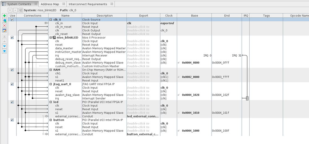 I have created a very simple Nios II environment with 2 buttons button as a PIO input width 2, and leds as a PIO output width 2.