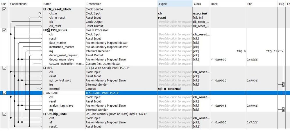 Hi, I'm working on a project where I have to use the SPI Communication to interface the DE10 nano board (master) with an ADC (slave) to convert the anolog signal to a binary value. I checked and I saw that there is a SPI (3 wire serial) core built in Qsys, but I have no idea how to use it. I read in some documentations about the SPI core but I didn't understand very well. If anyone has any examples or can help me I appreciate it.