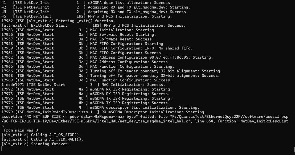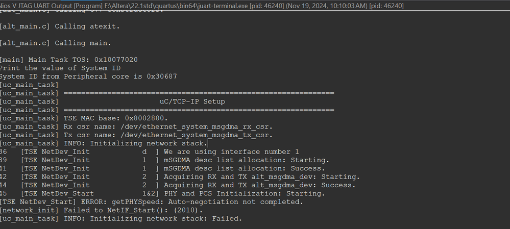 Hi, I'm currently learning to transfer data through Ethernet using Nios. Since I use Quartus Prime 22.1, the niche stack isn't there anymore, so I tried to use Nios V and uC/TCP IP base on the CVGT simple socket server reference design, I changed the SGDMA to mSGDMA, Nios II to Nios V. Everything else is exactly as in the reference design. The project compiled fine (although there is some timing requirement error on the nios_cpu sdram). I tested the Nios V with the code from the Arria 10 uC-TCP simple socket server. The processor started and failed at Auto-negotiation.