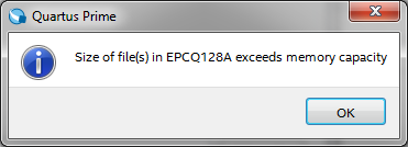 Then I tried to convert my .sof and .hex file to .jic, I got a problem. The problem was that size of files in EPCQ128A exeeded memory capacity.