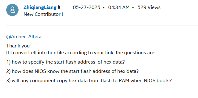 Hi, I am running NIOS II in Cyclone 10 LP 10CL120YF484. The flash I am using is M25P64 which is qspi interface. The problem is that EPCS flash controller is not compatible for Cyclone 10. I am go...
